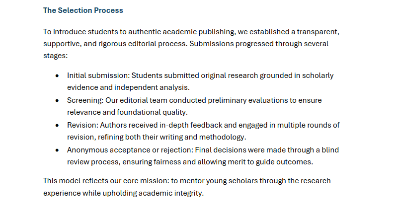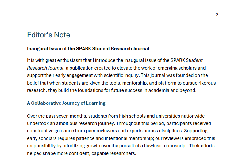 It is with great enthusiasm that I introduce the inaugural issue of the SPARK Student Research Journal, a publication created to elevate the work of emerging scholars and support their early engagement with scientific inquiry. This journal was founded on the belief that when students are given the tools, mentorship, and platform to pursue rigorous research, they build the foundations for future success in academia and beyond. (…)